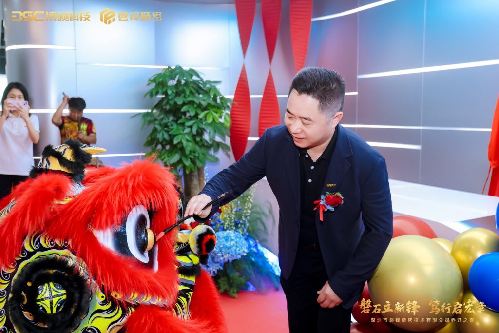 盛典融入醒狮点睛、采青纳福仪式,醒狮腾跃衔取“大展宏图,前程似锦”卷轴,寓意磐锋精密将在集团引领下“摘得行业硕果,再攀事业高峰”。随后,博硕科技集团与子公司领导共同为新址剪彩,银灰科技感外墙与流线型LOGO灯光交相辉映,金色礼炮齐鸣昭示新征程启航。